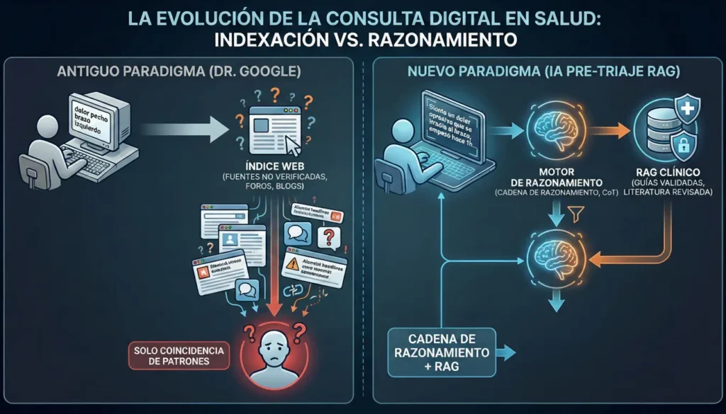 Durante dos décadas, el primer instinto ante un síntoma desconocido fue acudir a motores de búsqueda generalistas. Este fenómeno, coloquialmente conocido como «Dr. Google», se basaba en una arquitectura de recuperación de información indexada: el usuario introducía palabras clave y recibía una lista de enlaces con fiabilidad variable, delegando la síntesis y la evaluación de la gravedad enteramente en el juicio de una persona no experta y, a menudo, ansiosa.