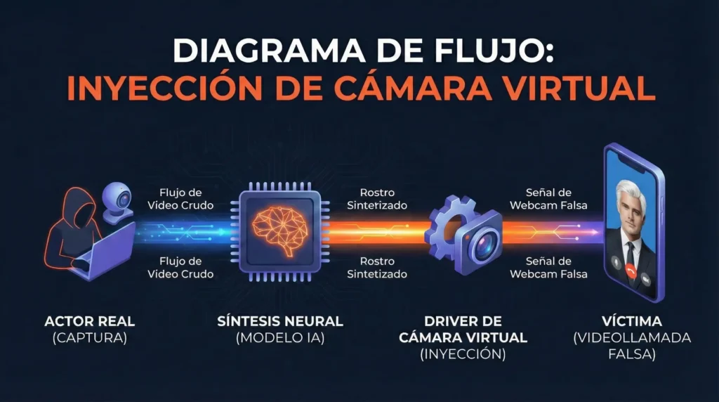 Para entender cómo se engaña a un CEO en directo, debemos dejar de pensar en esto como un «vídeo falso» y empezar a verlo como un secuestro de señal. En una videollamada legítima, la ruta de datos es directa: la luz entra por la lente, el sensor la convierte en bits y la aplicación transmite esos bits. En este ataque, los criminales rompen esa cadena física introduciendo un intermediario de software: el Driver de Cámara Virtual.