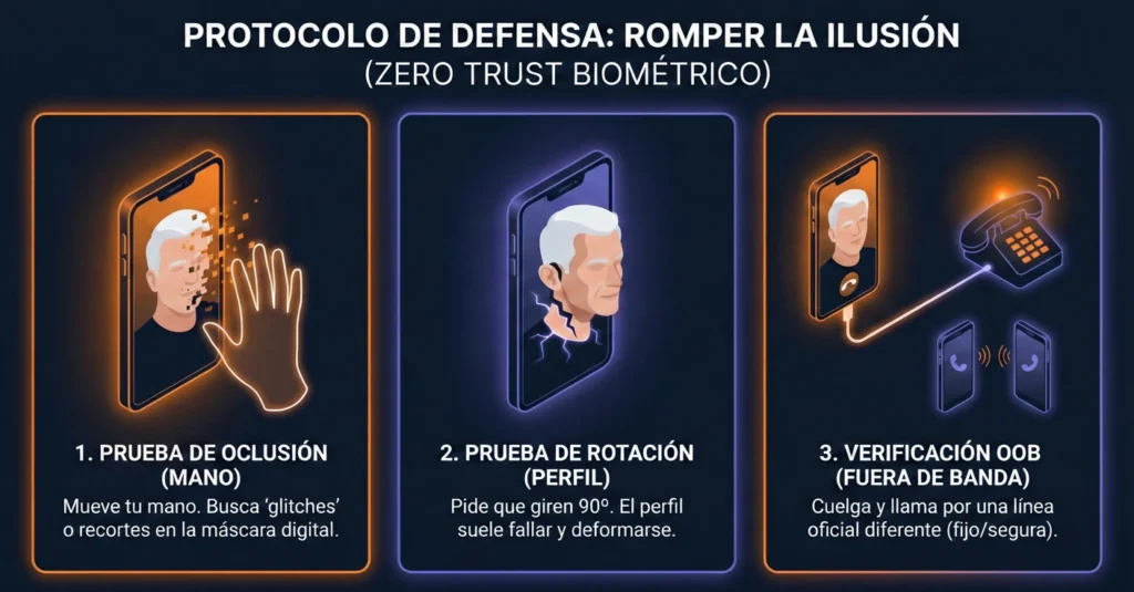 Ante la caída de la verificación visual, la defensa debe basarse en el concepto de «Zero Trust Biométrico». Si recibes una videollamada de alto nivel no solicitada, la pasividad es tu enemiga. Debes asumir un rol activo para forzar fallos en el modelo generativo.
