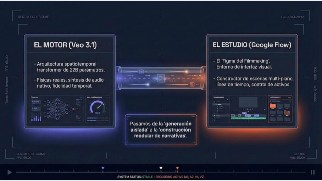 La adopción de Google Veo 3.1 dentro de la interfaz creativa Flow representa un cambio fundamental en la metodología de la cinematografía digital, marcando la transición definitiva de experimentos generativos aislados a un entorno de producción cohesivo. Este modelo, caracterizado por su arquitectura de transformador espaciotemporal de 22 mil millones de parámetros, está diseñado específicamente para resolver las limitaciones históricas del vídeo sintético, eliminando la decoherencia temporal, la inconsistencia física y la falta de sincronización audiovisual nativa. En este contexto de madurez tecnológica de 2026, el uso estratégico de Flow permite a los creadores profesionales gestionar narrativas complejas mediante la construcción modular de planos y el anclaje avanzado de activos, exigiendo una reevaluación profunda de las técnicas de ingeniería de prompts.