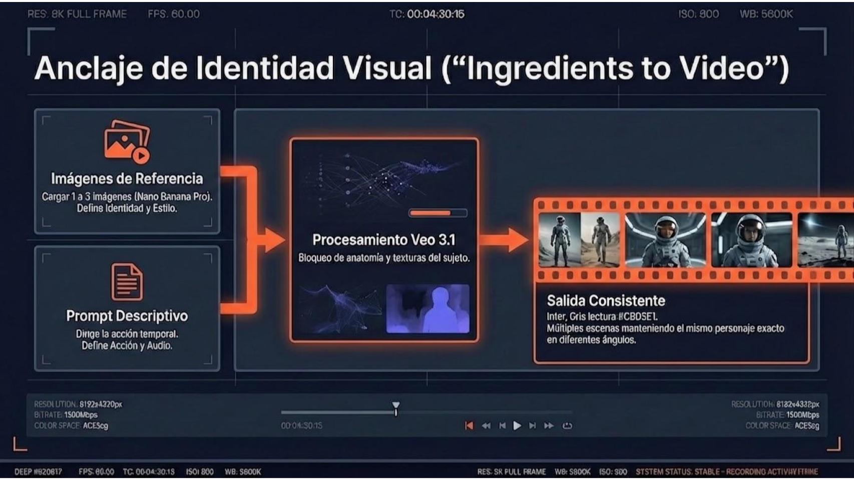 Para garantizar la coherencia visual, Flow incorpora un sistema de anclaje de identidad denominado ingredientes de vídeo. Esta característica permite cargar hasta tres imágenes de referencia, como un retrato frontal, una vista de perfil y un objeto específico, creando un ancla inmutable. Al referenciar estos activos en el prompt mediante etiquetas específicas, el modelo asegura que el protagonista mantenga rasgos faciales, vestimenta y características físicas consistentes a través de escenarios dispares, resolviendo uno de los mayores retos para el contenido de marca.
