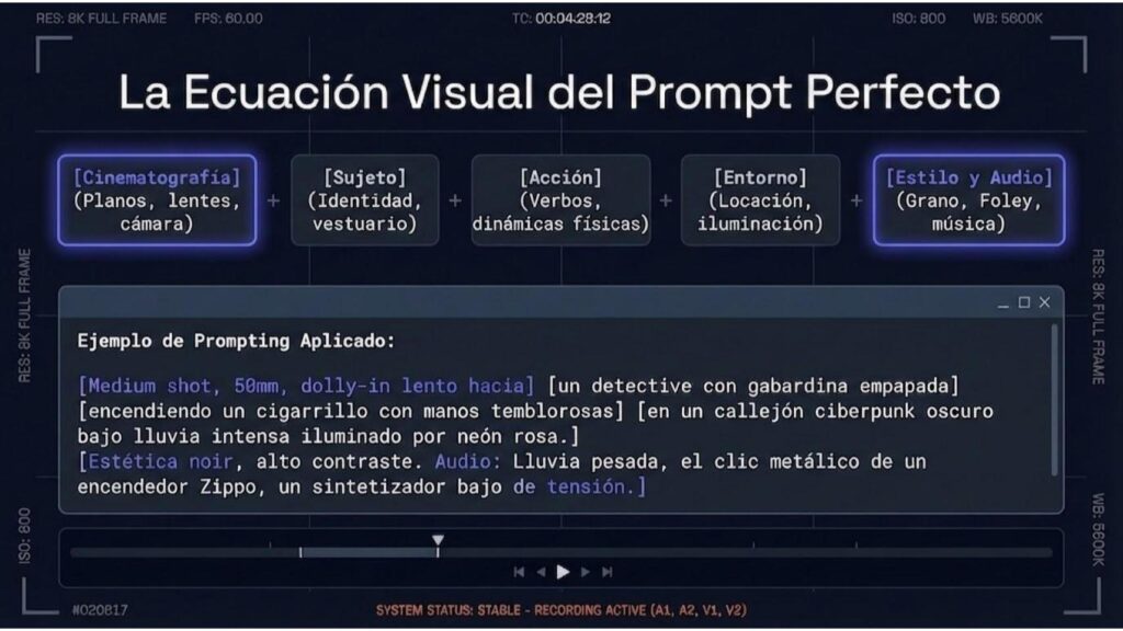 El diseño sonoro se aborda de manera integrada mediante una sintaxis específica. Los creadores deben utilizar etiquetas claras para separar la descripción visual de la auditiva, definiendo desde el timbre de voz de un personaje hasta el género y la instrumentación de una partitura musical. Relacionar los efectos de sala con acciones visibles específicas garantiza una sincronización orgánica durante el renderizado.