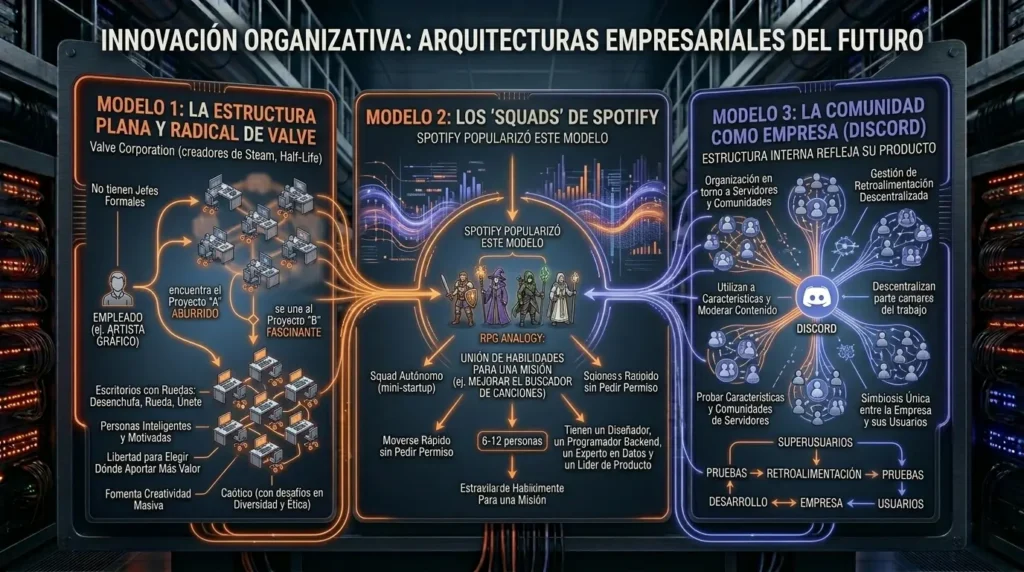 Poseer la tecnología del siglo veintidós resulta inútil si la arquitectura corporativa sigue anclada en el siglo diecinueve. La innovación organizativa es el tejido que sostiene el impacto tecnológico. Historicamente, hemos visto extremos como Valve Corporation, creadores de la plataforma Steam, cuya estructura radicalmente plana permite a los empleados mover literalmente sus escritorios con ruedas para unirse a los proyectos que consideren más valiosos, eliminando las jerarquías formales. Spotify, por su parte, popularizó el modelo de escuadrones autónomos similares a grupos de aventureros en un juego de rol, dotados de todas las disciplinas necesarias para lanzar productos sin burocracia. No obstante, en 2026, la realidad exige una evolución híbrida donde la autonomía de estos equipos conviva con una fuerte dirección estratégica central para alinear el uso de la inteligencia artificial en toda la empresa.