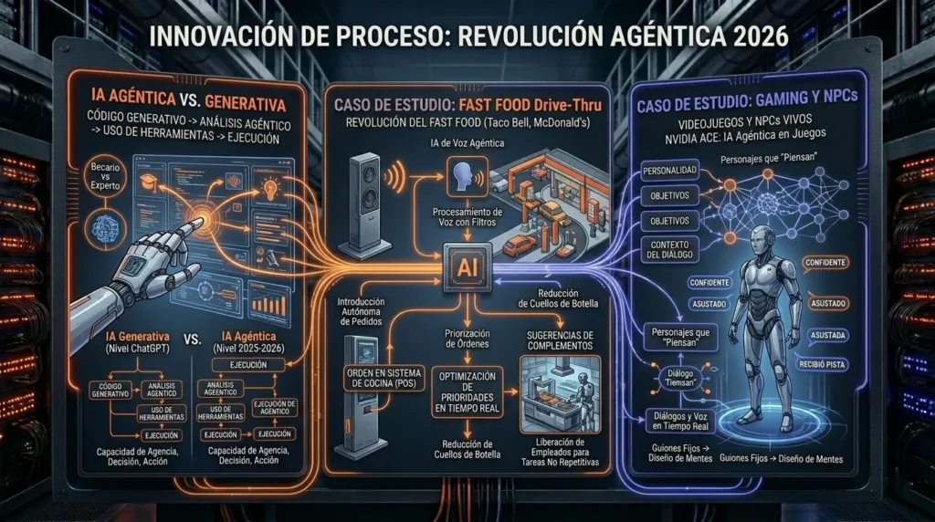 Superamos la IA generativa pasiva. Los agentes actuales toman decisiones y ejecutan flujos de trabajo en el mundo real, desde cocinas de comida rápida hasta NPCs con mentes propias en el gaming.