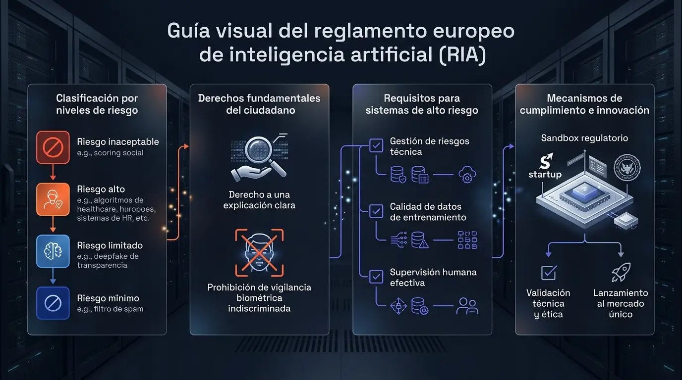 La normativa emplea un enfoque estratificado donde los sistemas de riesgo inaceptable quedan prohibidos, mientras que los de riesgo alto deben cumplir con requisitos técnicos estrictos de transparencia, calidad de datos y supervisión humana permanente.