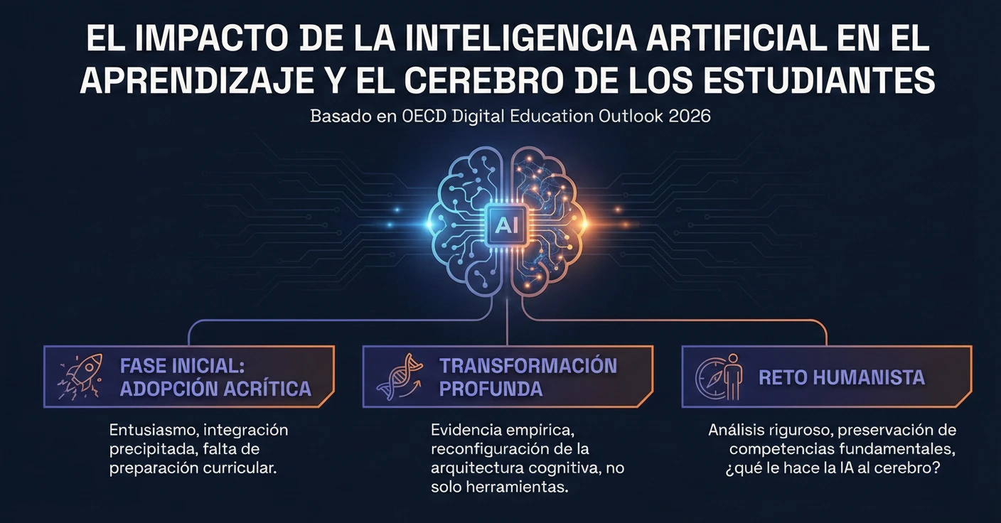 El presente artículo tiene como propósito sintetizar los hallazgos críticos y los elementos fundamentales del informe OECD Digital Education Outlook 2026: Exploring Effective Uses of Generative AI in Education. La publicación de este estudio marca un punto de inflexión definitivo y necesario en nuestra comprensión de la tecnología dentro del aula. Tras una fase inicial de adopción entusiasta, caótica y a menudo acrítica —caracterizada por la integración precipitada de modelos de lenguaje en currículos no preparados—, el ecosistema educativo global se enfrenta ahora a la evidencia empírica de una transformación profunda. Esta transformación afecta no solo a la metodología de enseñanza o a la eficiencia administrativa, sino a la propia biología del aprendizaje humano. No estamos ante una simple actualización de herramientas digitales comparable a la introducción de la calculadora científica en los años ochenta o de internet en los noventa; nos encontramos frente a una reconfiguración de la arquitectura cognitiva que exige un análisis riguroso, desprovisto de hipérboles comerciales y centrado en la preservación de las competencias fundamentales que definen nuestra especie.