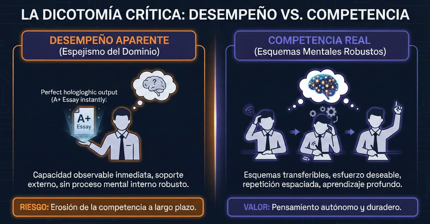 La distinción técnica entre desempeño y competencia se ha vuelto, por tanto, la piedra angular de la nueva pedagogía. El desempeño se refiere a la capacidad observable de completar una tarea específica en un momento dado, a menudo con el soporte de ayudas externas o andamiajes tecnológicos sofisticados. La competencia, en cambio, implica la posesión de esquemas mentales robustos, duraderos y transferibles que permiten al individuo aplicar ese conocimiento a situaciones nuevas, complejas e inéditas sin asistencia alguna. Los datos masivos recopilados por la OCDE sugieren una tendencia alarmante: el uso indiscriminado y no guiado de la IA para la resolución inmediata de problemas eleva espectacularmente el desempeño a corto plazo, creando una sensación de eficacia y dominio tanto en el alumno como en el evaluador, pero erosiona sistemáticamente la competencia a largo plazo. El estudiante se convierte en un editor de alto nivel, capaz de juzgar la estética de la respuesta, pero incapaz de generarla o verificar su veracidad desde primeros principios.