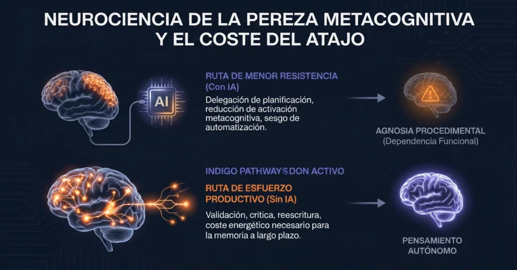 Profundizando en los mecanismos biológicos, el informe alerta sobre el riesgo real de atrofia en las funciones ejecutivas del cerebro joven. Cuando un estudiante delega la planificación, estructuración y redacción de un texto en un modelo de lenguaje, se observa mediante resonancia magnética funcional una reducción significativa en la activación de las redes neuronales asociadas con la metacognición. La metacognición es la capacidad humana de pensar sobre el propio pensamiento, de monitorizar el proceso de aprendizaje, detectar inconsistencias internas y ajustar las estrategias en tiempo real. El cerebro humano, que es un órgano evolutivamente diseñado para optimizar el consumo de energía y evitar el gasto calórico innecesario, tiende rápidamente a lo que se conoce como pereza cognitiva o descarga cognitiva (cognitive offloading).