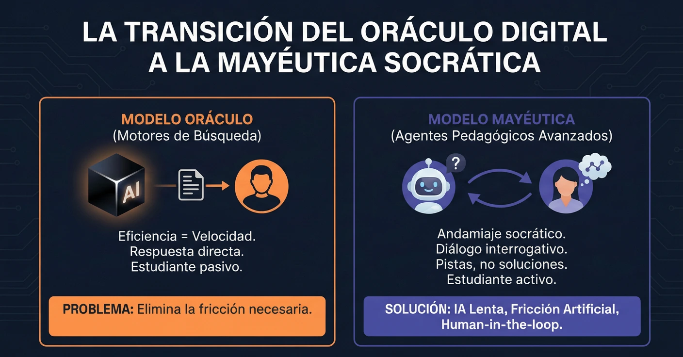 El modelo de «motor de respuestas» es pedagógicamente tóxico. La solución técnica reside en agentes de IA Lenta (Slow AI) diseñados para el andamiaje socrático: no dan respuestas, sino que formulan preguntas y pistas que obligan al estudiante a construir el conocimiento, manteniendo al humano en el bucle cognitivo.