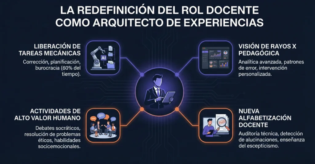 En este nuevo paradigma educativo, el temor existencial a la sustitución del profesorado por algoritmos se desvanece para dar paso a una realidad mucho más compleja, sofisticada y exigente: la necesidad de un docente orquestador. La inteligencia artificial, por muy avanzada que sea en 2026, sigue siendo un sistema probabilístico sin consciencia; no puede replicar la empatía, la motivación intrínseca, la inspiración moral ni la comprensión sutil del contexto cultural y emocional de un estudiante. Sin embargo, sí tiene la capacidad inigualable de liberar al educador de las tareas mecánicas, administrativas y repetitivas que históricamente han consumido hasta el 60% de su tiempo y energía (corrección de pruebas estandarizadas, planificación burocrática, gestión de asistencia).
