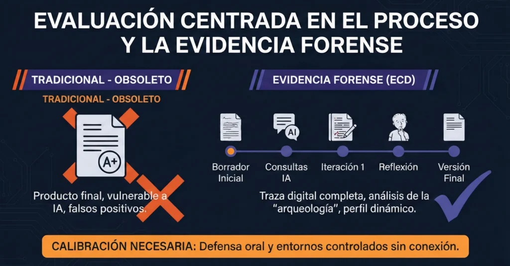 El examen final de producto ya no es garantía de autoría. El nuevo estándar es el Evidence-Centered Design (ECD), que evalúa la traza digital del proceso de creación: borradores, tiempos de edición y evolución de ideas. Se califica el viaje intelectual, no solo el destino.