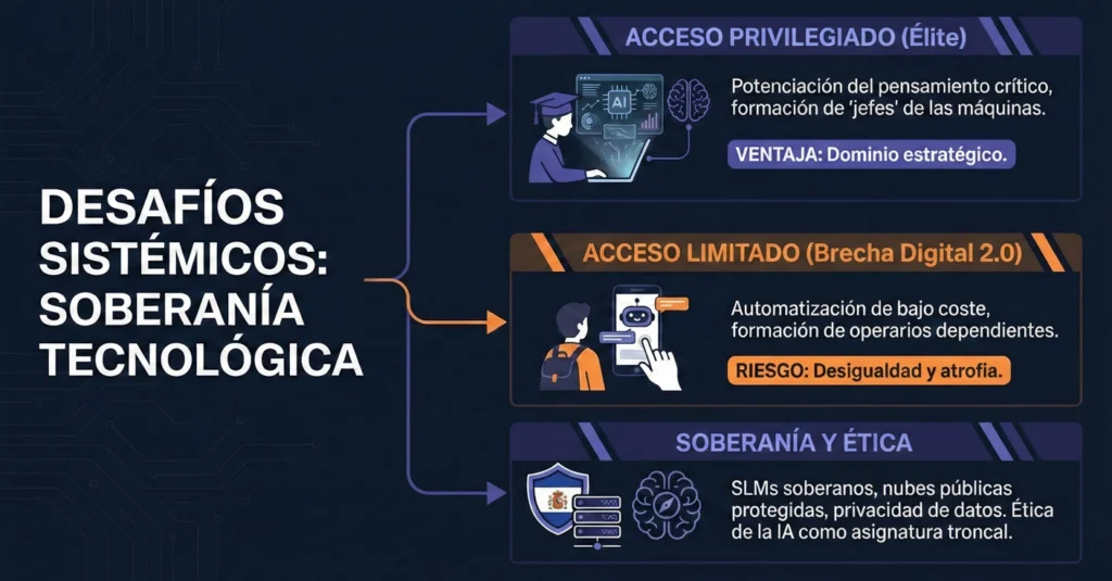 La equidad en 2026 exige políticas públicas agresivas y visionarias que garanticen el acceso universal no solo a la tecnología, sino a tutores inteligentes de alta calidad pedagógica (ajustados para el andamiaje, no para la solución) y a currículos centrados en la agencia humana. Finalmente, la cuestión de la soberanía de los datos y la independencia tecnológica se ha vuelto un tema de seguridad nacional. Las instituciones educativas y los gobiernos no pueden permitirse ser meros clientes pasivos de corporaciones tecnológicas extranjeras que operan cajas negras inescrutables con los datos cognitivos y conductuales de sus ciudadanos más jóvenes.
