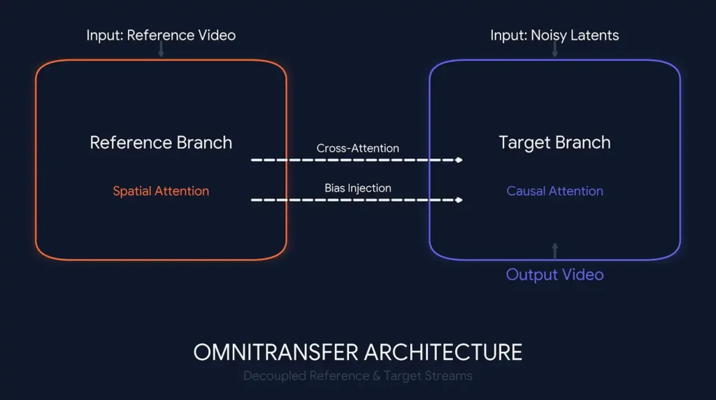 Los modelos tradicionales procesan la referencia y el objetivo juntos. Esto provoca que el fondo de la imagen original se mezcle con el nuevo video, o que el movimiento se vuelva rígido. OmniTransfer elimina esto separando los flujos de datos.