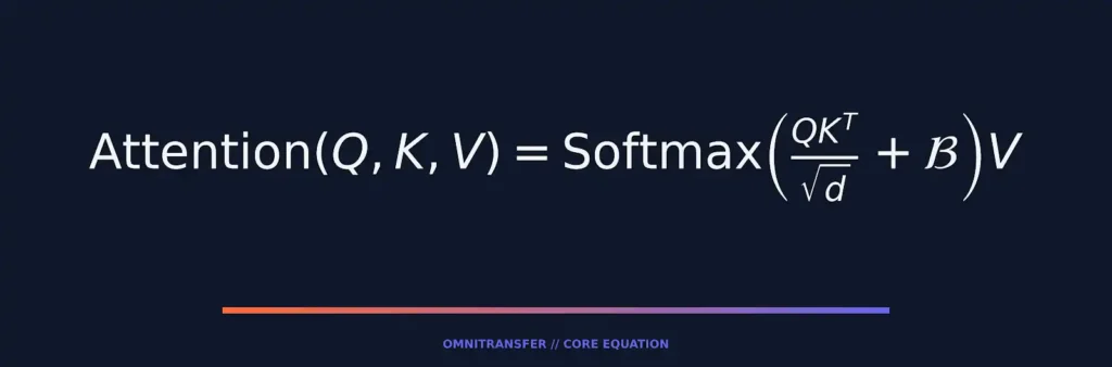 OmniTransfer introduce un mecanismo de Inyección de Sesgo (Bias Injection) en las capas de atención. El modelo calcula una matriz de sesgo aprendible $\mathcal{B}$ que se suma a los mapas de atención: