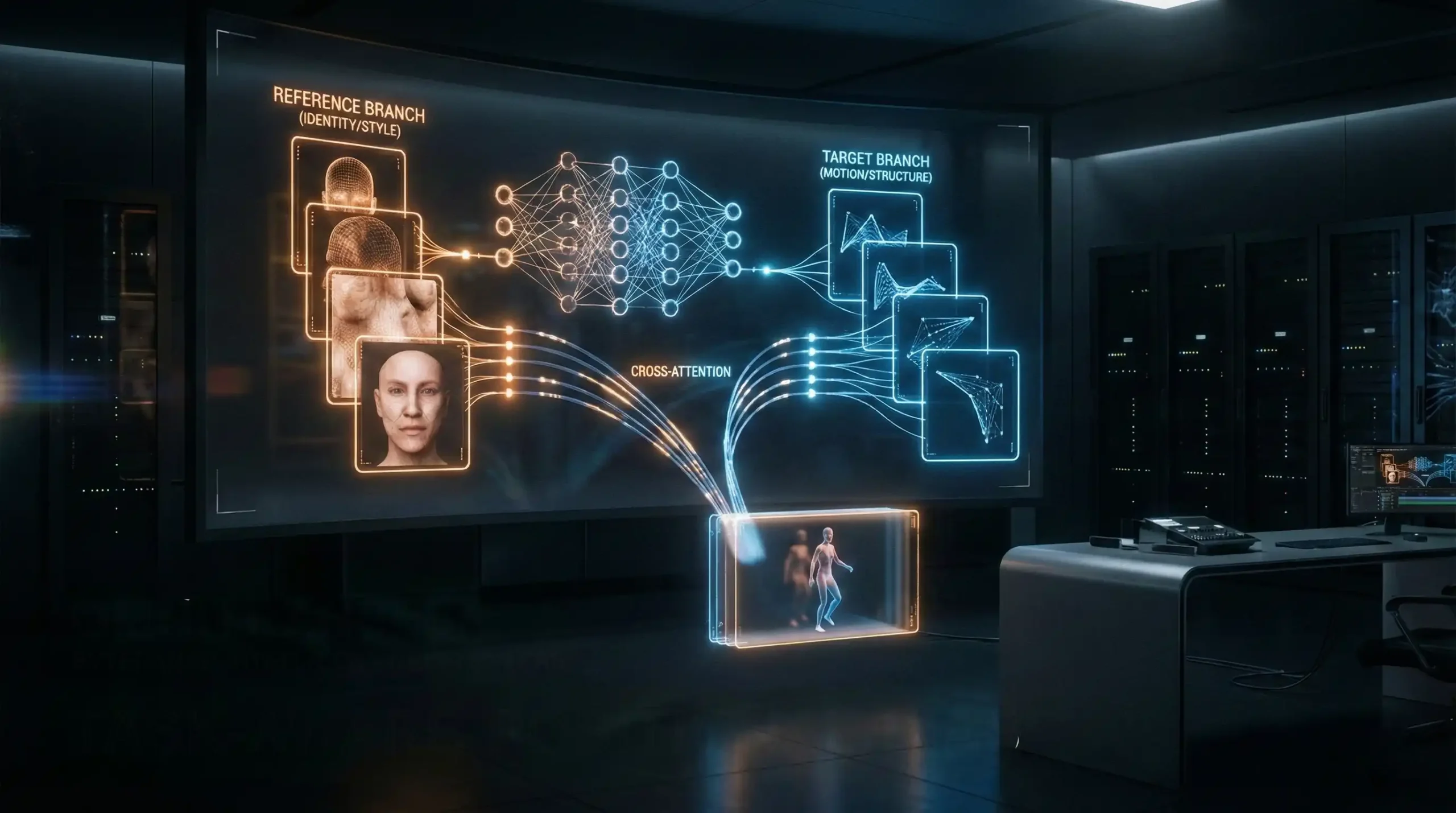 • Reference Branch (Rama de Referencia): Procesa la imagen o video guía (identidad/estilo). Esta rama extrae las features espaciales sin ruido.