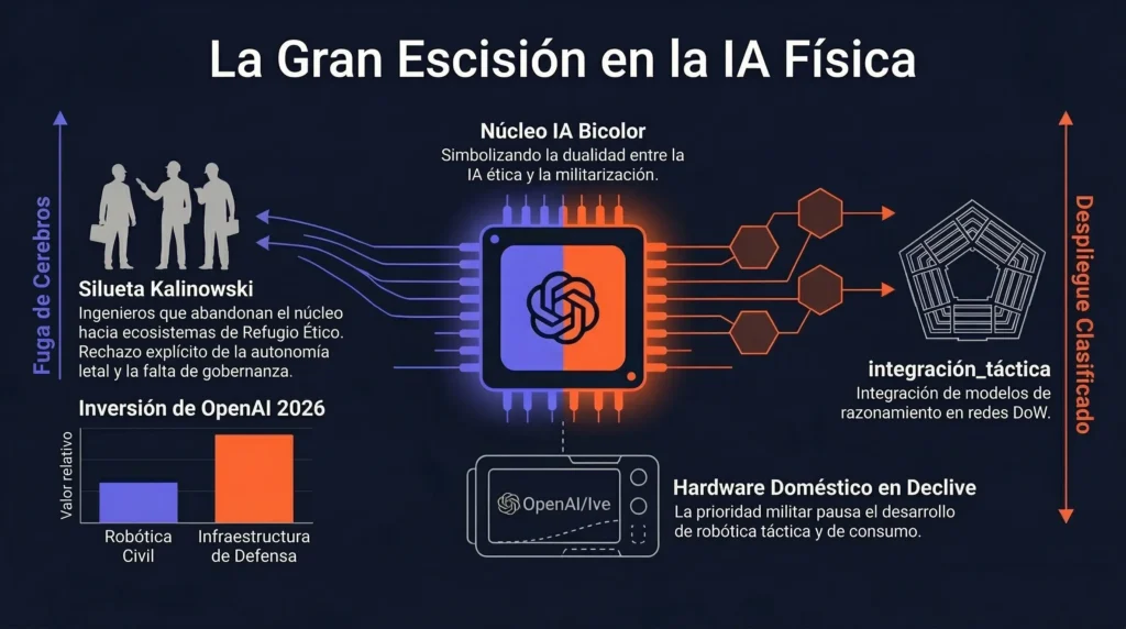 Crisis de identidad corporativa. La salida de Caitlin Kalinowski no es un simple cambio de ejecutivos, sino la confirmación de que OpenAI ha priorizado la escala militar sobre la ética en el desarrollo de hardware y robótica en este 2026.