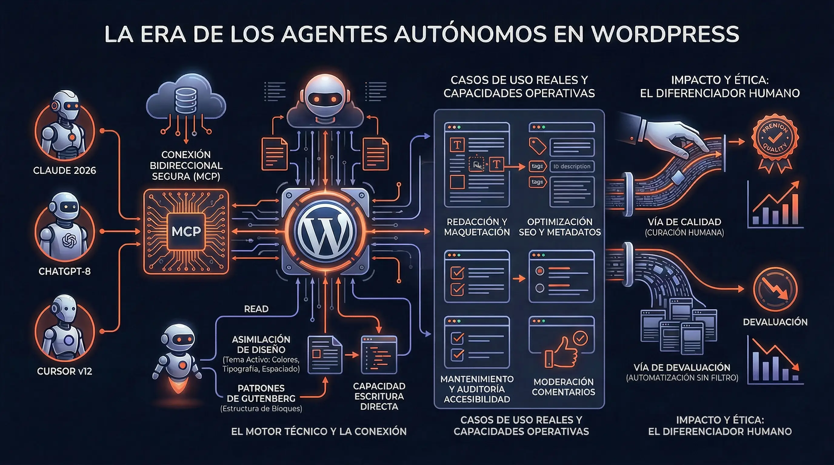 Delegación absoluta de la carga técnica. Un agente puede ahora maquetar un artículo, asignar categorías, generar textos alternativos para imágenes y auditar la accesibilidad en cuestión de segundos, sin abrir el panel de administración.